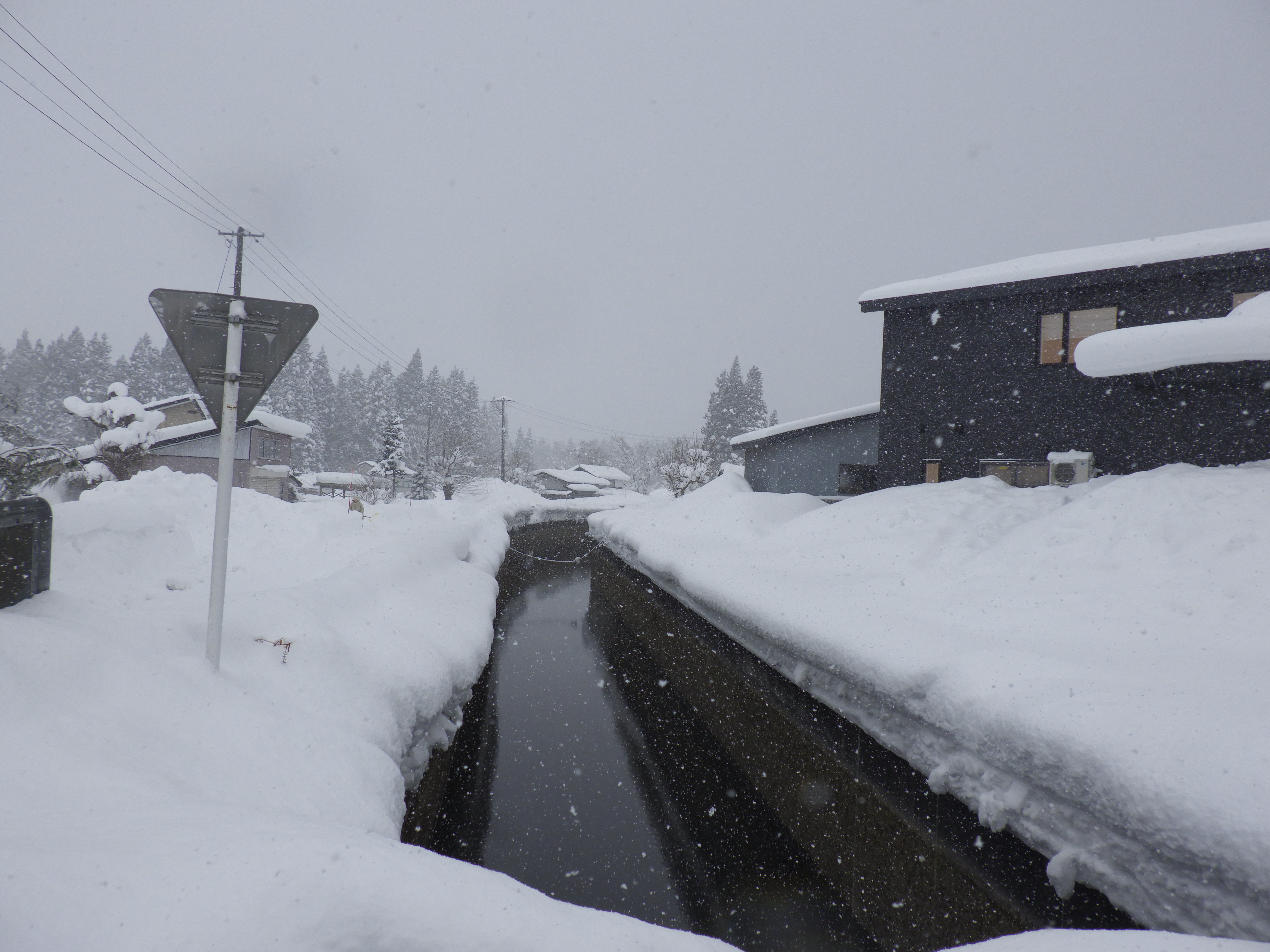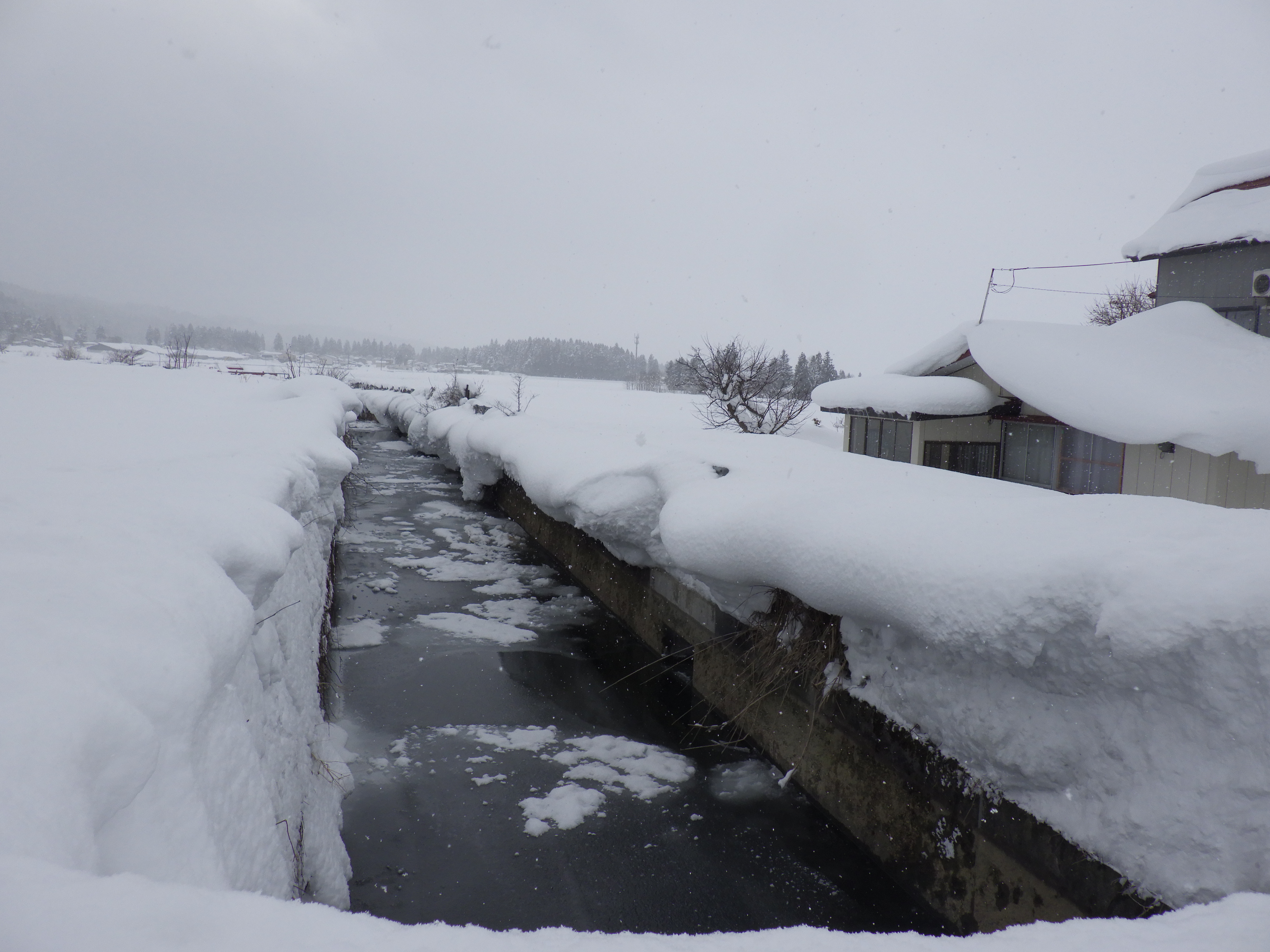 中流域では幹線水路の水量が少ないため、雪庇が崩れ落下した雪や、上流から流れてきた雪が溶けきれないまま次々に堆積し、管理に支障を来しています。