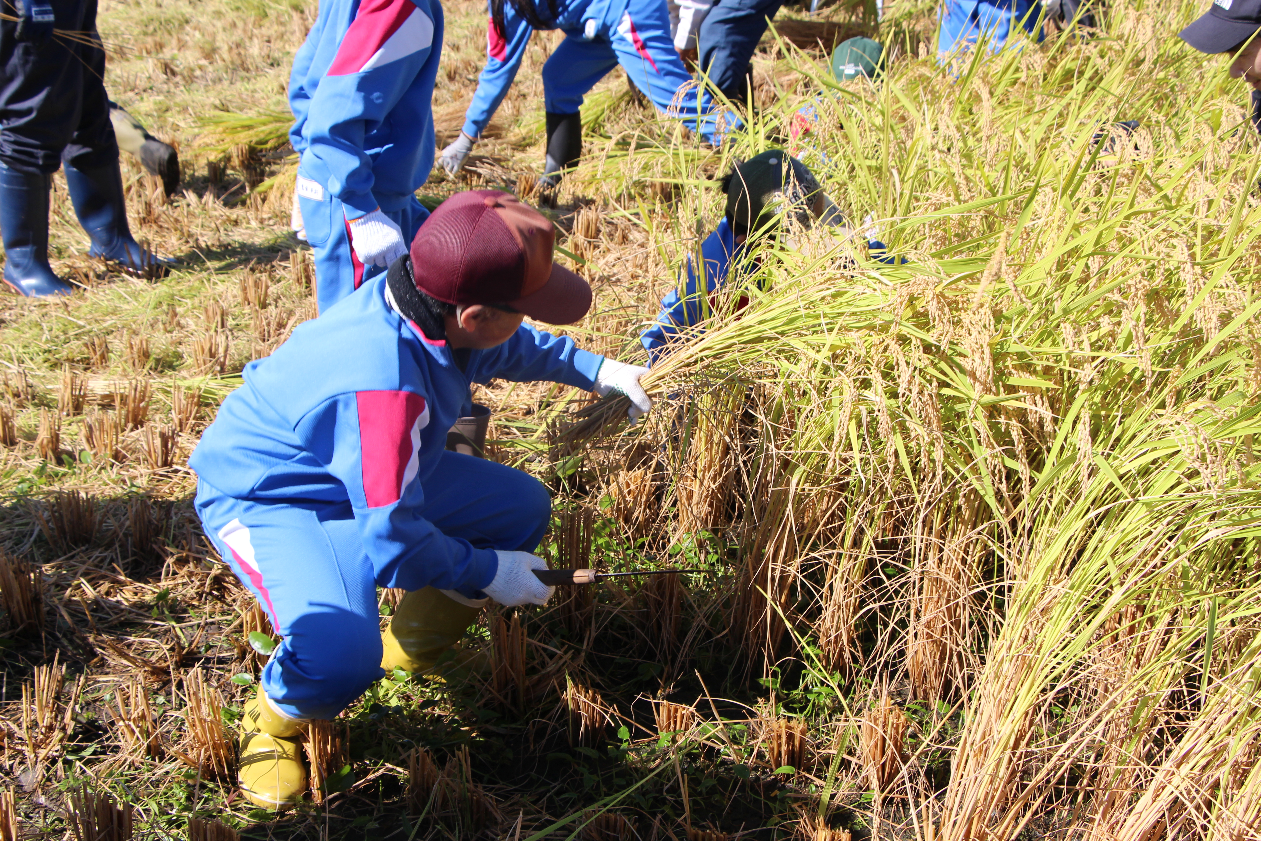 稲刈り開始直後の様子です。上級生が稲を刈って束ね、下級生がコンバインへと稲を運んでいきます。
