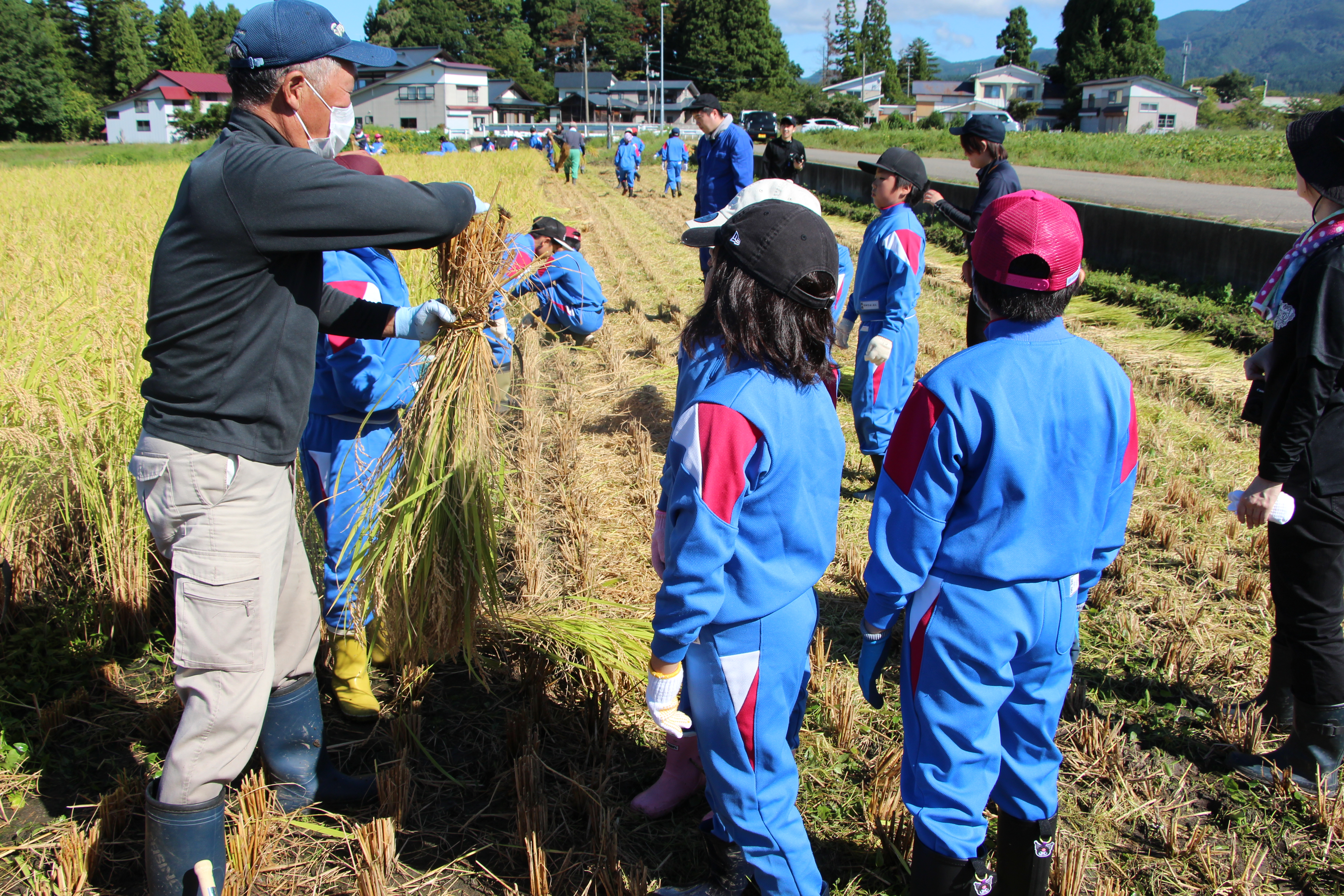 9月19日に太田東小学校で稲刈り体験が行われました。当初は17日に実施予定でしたが、雨天のため、19日に延期となりました。前日までの降雨で田はぬかるんでおりましたが、当日は晴天に恵まれ、無事に稲刈りを終えることができました。